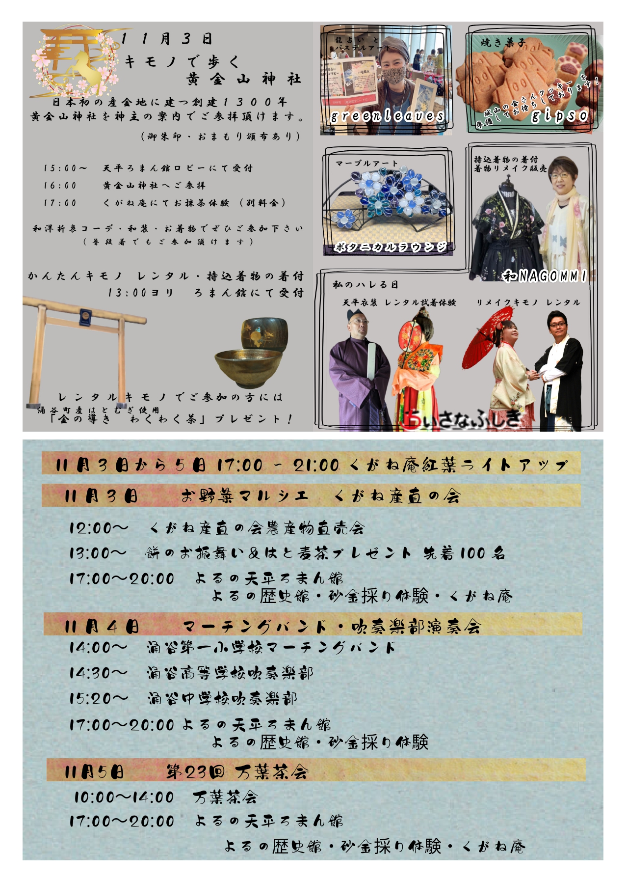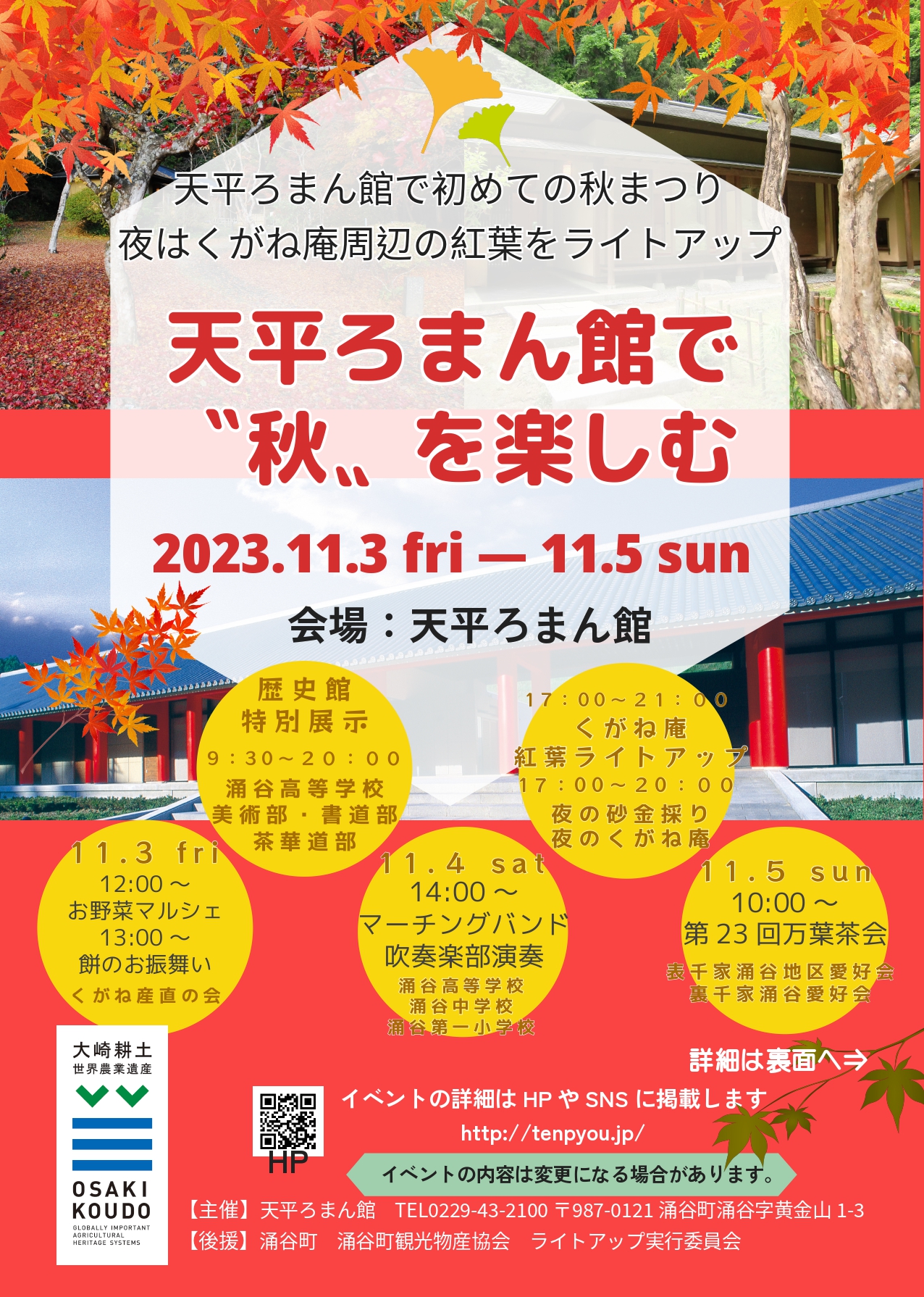 涌谷町の秋の魅力をひとまとめにしたイベントを開催します。3日間を通して食欲、芸術、音楽が楽しめる今年初めて開催するイベントです。